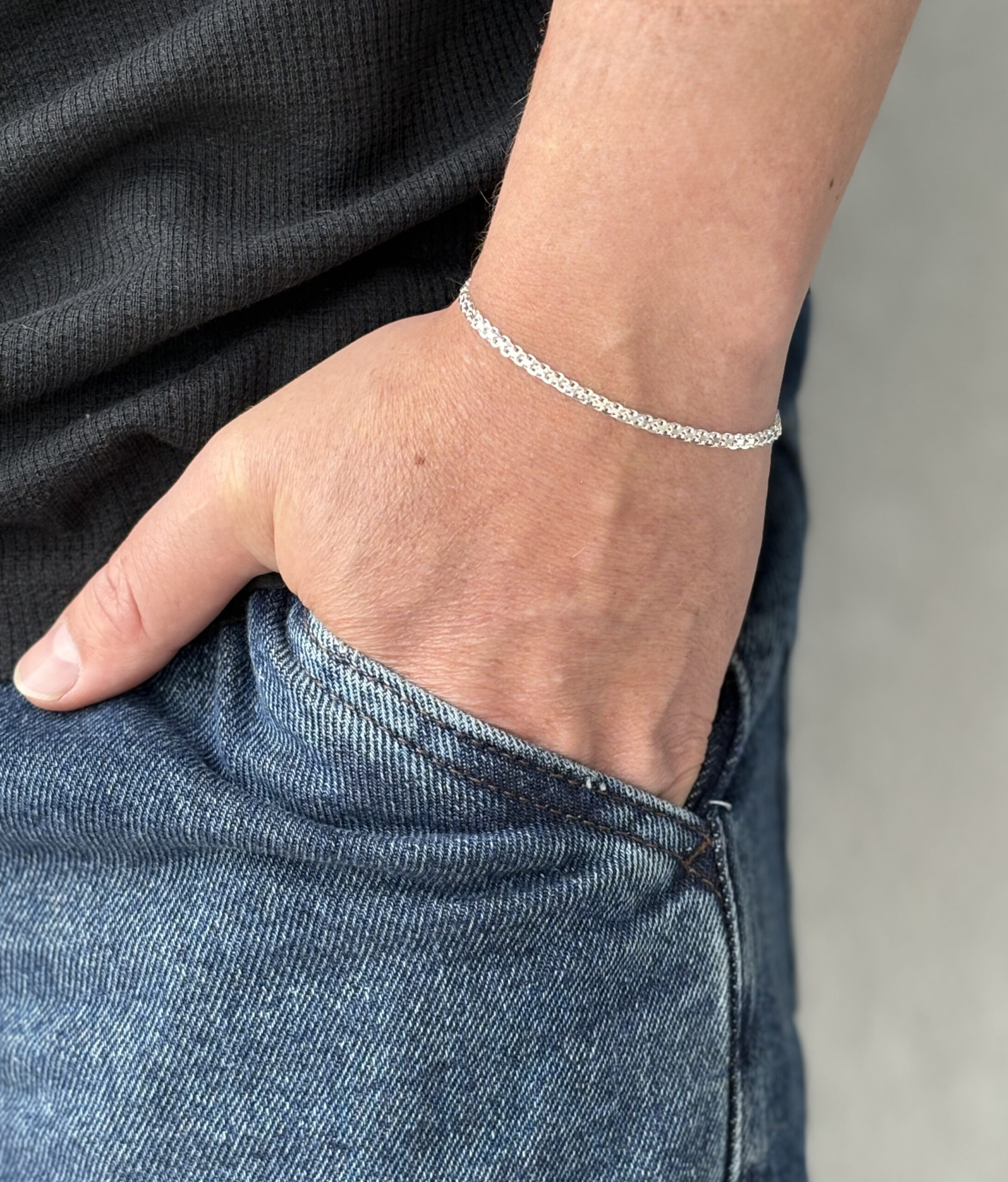 A Pulseira Esteira em Prata 925 une estilo e sofisticação em um design moderno. Seus elos interligados garantem brilho e leveza, resultando em uma peça versátil e elegante para qualquer ocasião.