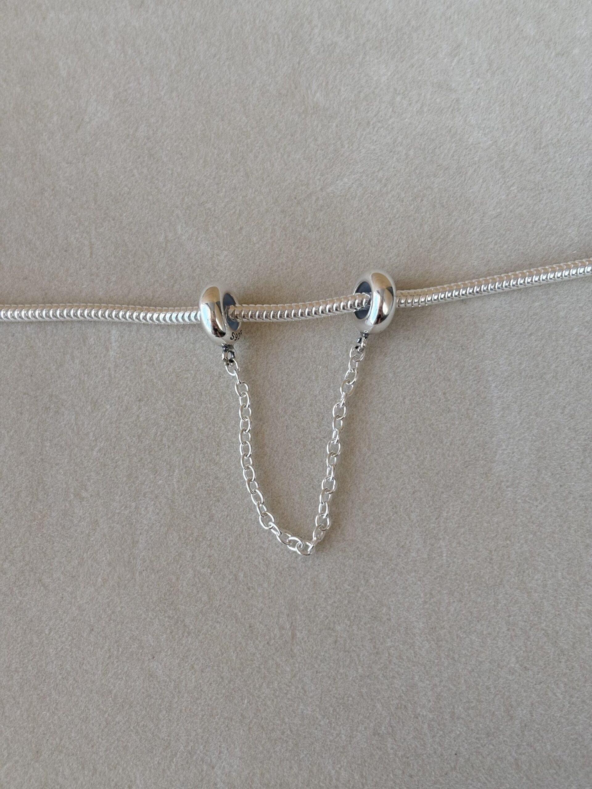 Segurança e elegância em um só detalhe. A Trava de Segurança Lisa com Corrente é feita em Prata 925 e foi criada para proteger sua pulseira de berloques contra quedas e aberturas inesperadas. Seu design liso e minimalista combina perfeitamente com qualquer estilo de pulseira, mantendo seus berloques seguros com sutileza e sofisticação.